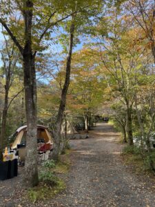 キャンプ場内の道路は、砂利道で道幅が狭く傾斜がある箇所もあります。